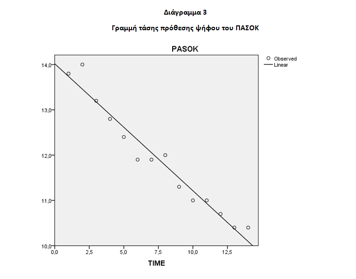 Το ΠΑΣΟΚ ακολουθεί σχεδόν πλήρως τη γραμμική τάση ως προς την παρατηρηθείσα πρόθεση ψήφου της περιόδου βάσης. Παρατηρείται επίσης απόλυτη στατιστική σημαντικότητα των συντελεστών της εξίσωσης παλινδρόμησης3. Η εκτιμηθείσα γραμμή τάσης όπως και οι παρατηρηθείσες τιμές Ιανουαρίου 2022-Φεβρουαρίου 2023 παρουσιάζονται στο διάγραμμα 3. Είναι και εδώ εμφανής η προσέγγιση των ανωτέρω τιμών στην γραμμή τάσης ως και η καθοδική πορεία της πρόθεσης ψήφου.