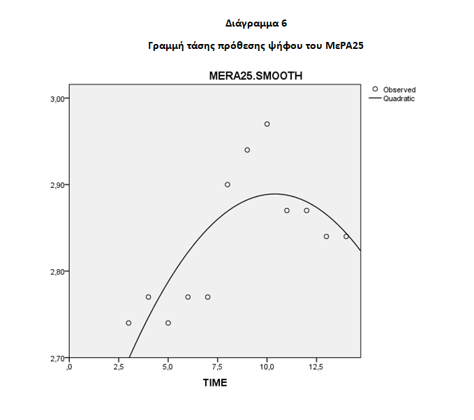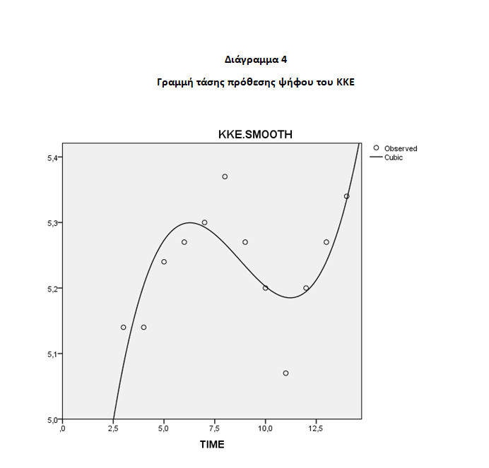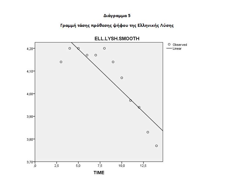 Με βάση την παραπάνω μορφή εξίσωσης, το κόμμα προβλέπεται να πάρει ποσοστό 2,9 % στις εκλογές του Μαΐου. Η γραμμική τάση, με μικρότερη πάντως ερμηνευτική ικανότητα, εκτιμά ποσοστό στα ίδια επίπεδα (2,944).