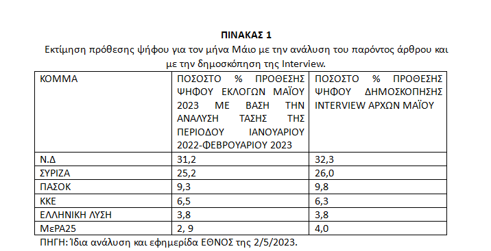 Με βάση τα παραπάνω έγινε μια πρόβλεψη της πρόθεσης ψήφου για κάθε κόμμα της παρούσας Βουλής και για τον μήνα Μάϊο του 2023, δηλαδή του μήνα των εκλογών. Ως περίοδος βάσης (ιστορικά/υπάρχοντα στοιχεία) χρησιμοποιήθηκαν τα ποσοστά της πρόθεσης ψήφου που προέκυψαν ως μέσοι όροι κατά μήνα οκτώ δημοσκοπήσεων, όπως δημοσιεύτηκαν στην εφημερίδα ΜΑΚΕΔΟΝΙΑ στις 22 Φεβρουαρίου 2023 και αφορούν τους μήνες Ιανουαρίου 2022- Φεβρουαρίου 2023. Η περίοδος αυτή δυστυχώς δεν περιλαμβάνει δύο τουλάχιστον πλήρεις περιόδους (έτη) για να εκτιμηθεί η επίδραση της κυκλικής κίνησης και της εποχικότητας, αλλά όπου υπήρξε τυχαία κίνηση έγινε εξομάλυνση της σειράς με τη μέθοδο των κινητών μέσων. Επίσης, η εκτίμηση της τάσης έγινε με την μορφή συνάρτησης που εφαρμόζει με τον καλύτερο τρόπο στα δεδομένα της περιόδου βάσης κατόπιν σχετικού ελέγχου. Επίσης, η χρονολογική σειρά δεν περιλαμβάνει την επίδραση στην πρόθεση ψήφου του τραγικού δυστυχήματος των Τεμπών, το οποίο, ως έκτακτος παράγων ιδιαίτερα σημαντικός, θα επηρέαζε την πρόβλεψη. Φυσικά, η αξιοπιστία της πρόβλεψης εξαρτάται από την διάρκεια της επίδρασης που θα έχει το γεγονός αυτό στις εκλογές του Μαΐου, σύμφωνα με όσα αναφέρθηκαν παραπάνω. Γενικότερα, θα πρέπει να αναφερθεί ότι οι εν λόγω προβλέψεις υπόκεινται σε προϋποθέσεις και παραδοχές, οι οποίες δεν επαληθεύονται πάντα. Για παράδειγμα, μια αρκετά μεγαλύτερη χρονολογική σειρά διαθέσιμων αποτελεσμάτων σχετικών με την πρόθεση ψήφου θα ήταν πιο αξιόπιστη στις σχετικές προβλέψεις. Πέρα από τις ανωτέρω επιφυλάξεις, η παρούσα αναφορά παρουσιάζει μεθοδολογία πρόβλεψης της πρόθεσης ψήφου η οποία θα μπορούσε να χρησιμοποιηθεί για πιο σύνθετες αναλύσεις σχετικά με τις δημοσκοπήσεις.