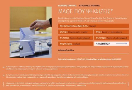 Με την εισαγωγή προσωπικών τους στοιχείων εδώ, οι ψηφοφόροι μπορούν να πληροφορηθούν το εκλογικό τμήμα στο οποίο ψηφίζουν. Αρκεί να συμπληρωθούν τα πεδία «Επώνυμο», «Ονομα», «Ονομα Πατέρα», «Ετος Γέννησης», «Ονομα Μητέρας» (προαιρετικό), ή μόνο τα πεδία Ε.Ε.Α. και Επώνυμο