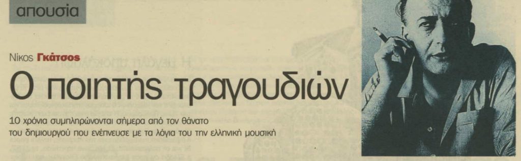 «ΤΟ ΒΗΜΑ» της 19ης Μαΐου 2002, τιμώντας τη συμπλήρωση δέκα ετών, τότε, από τον θάνατό του Νίκου Γκάτσου ζήτησε από σπουδαίους καλλιτέχνες που τον έζησαν ή και συνεργάστηκαν μαζί του, να μιλήσουν για εκείνον.