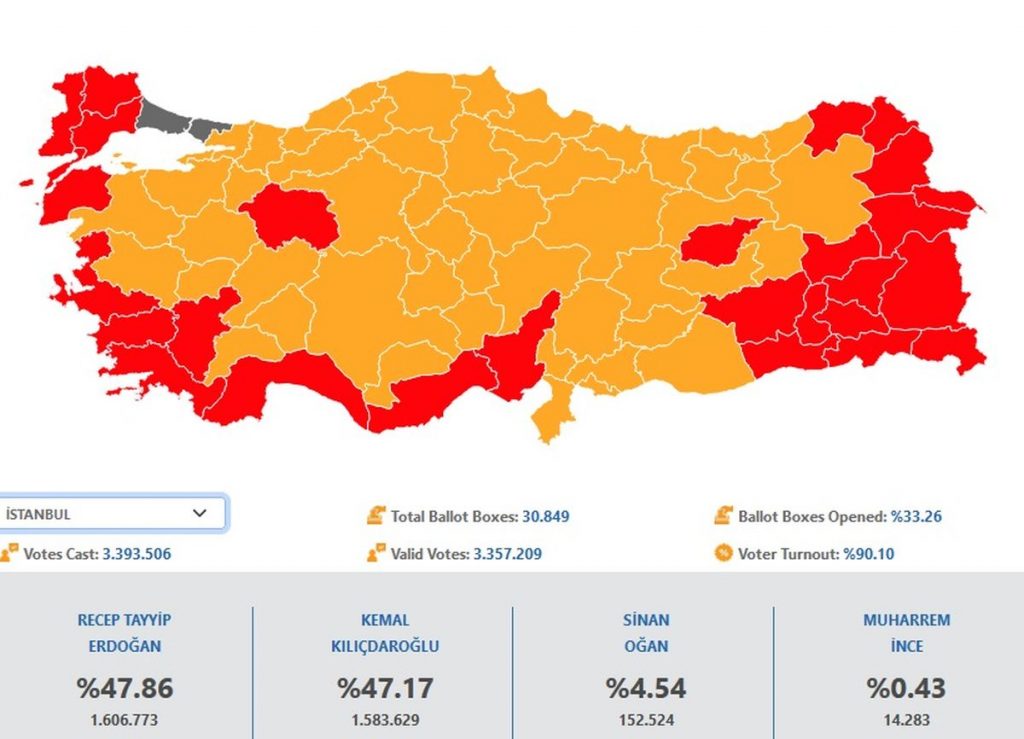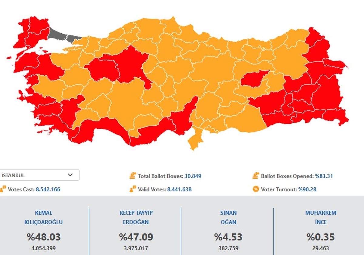 Στην Κωνσταντινούπολη, το οικονομικό κέντρο της Τουρκίας (λίγο πριν τις 8 το βράδυ) η μάχη ήταν σώμα με σώμα με τους δύο υποψήφιους να συγκεντρώνουν τα ίδια ποσοστά: 47,86% ο Ερντογάν και 47,17% ο Κιλιτσντάρογλου.