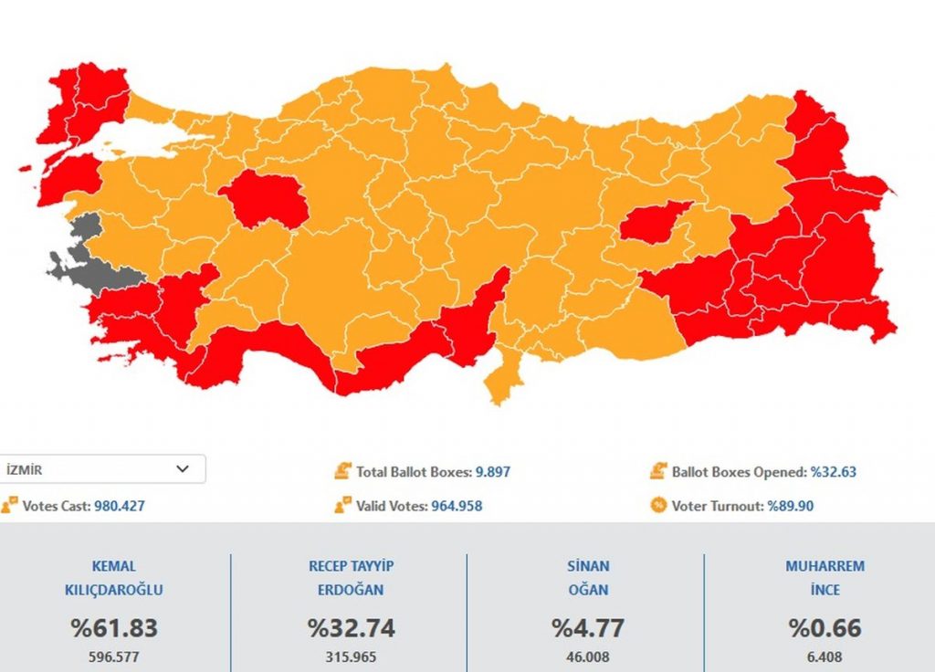 Όπως μεταδίδει το Anadolu η Σμύρνη (λίγο πριν τις 8 το βράδυ) ήταν η πόλη που ο Κιλιντσντάρογλου κέρδιζε με μεγάλη διαφορά, 61,83% έναντι 32,74% του Ερντογάν.