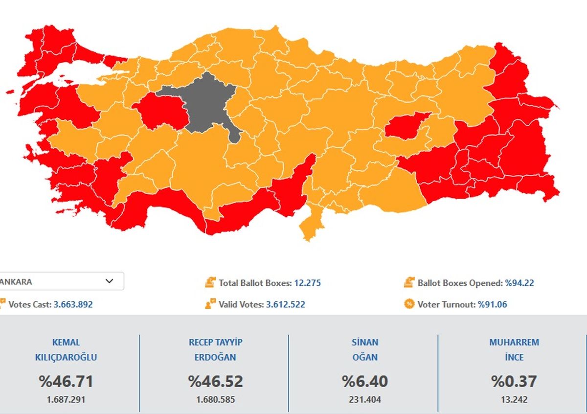 Τέλος στην Άγκυρα ο Ερντογάν προηγούνταν (λίγο πριν τις 20:00) με ποσοστό 51,19% έναντι 41,57% του Κιλιτσντάρογλου.