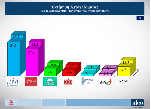 Στην εκτίμηση ψήφου της Alco η ΝΔ συγκεντρώνει 34,7-38,7%, ενώ ο ΣΥΡΙΖΑ 27,3-31,3%. Το ΠΑΣΟΚ από 7,8% έως 9,8%, το ΚΚΕ από 5,9%-7,9%, η Ελληνική Λύση από 2,7%-4,5%, το ΜέΡΑ25 από 2,6%-4,4% και άλλο κόμμα από 9,7%-12,7%.