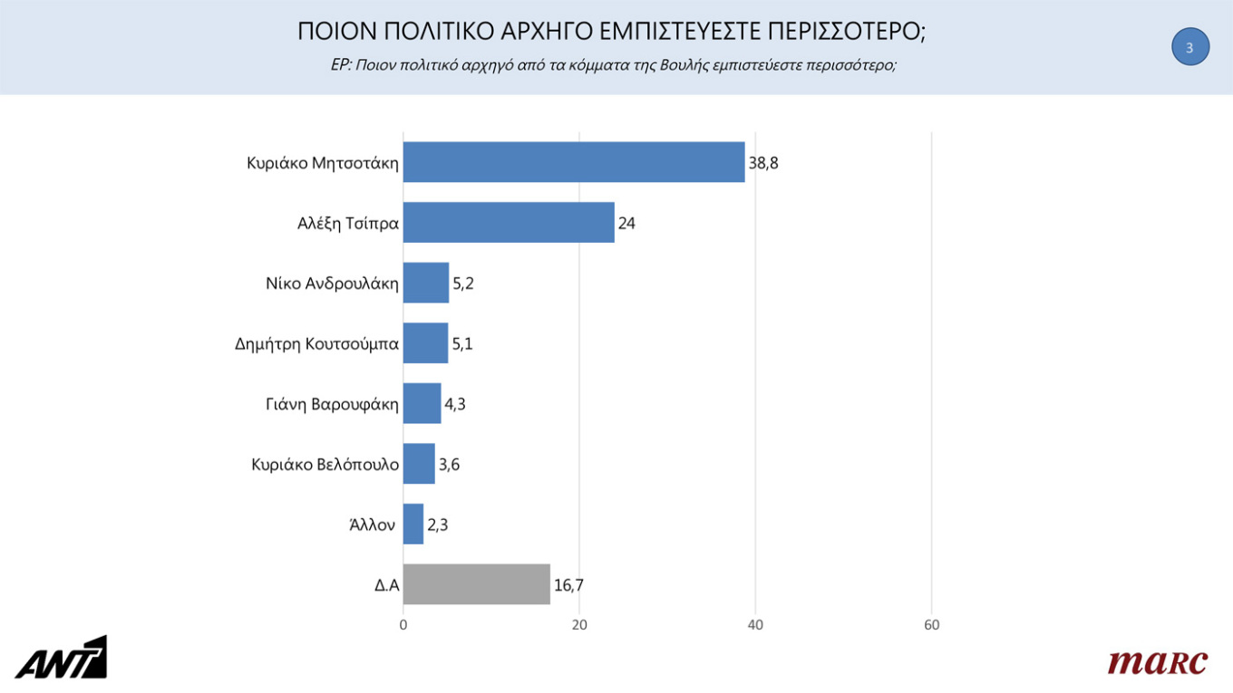 Όσον αφορά τα πρόσωπα των πολιτικών αρχηγών, οι πολίτες εμπιστεύονται περισσότερο, με ποσοστό 38,8% τον Κυριάκο Μητσοτάκη, ακολουθεί ο Αλέξης Τσίπρας με 24%, ο Νίκος Ανδρουλάκης με 5,2%, ο Δημήτρης Κουτσούμπας με 5,1%, ο Γιάνης Βαρουφάκης με 4,3% και ο Κυριάκος Βελόπουλος με 3,6%.