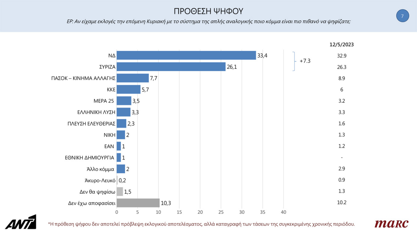 Συγκεκριμένα, η ΝΔ λαμβάνει στην πρόθεση ψήφου 33,4%, ο ΣΥΡΙΖΑ 26,1%, το ΠΑΣΟΚ-ΚΙΝΑΛ 7,7%, το ΚΚΕ 5,7%, η Ελληνική Λύση 3,3% και το ΜέΡΑ25 3,5%.