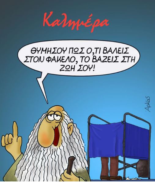 Σκιτσάροντας έναν ψηφοφόρο που βρίσκεται πίσω από το εκλογικό παραβάν προκειμένου να επιλέξει το ποιον θα ψηφίσει και τον σοφό του γέροντα, μπροστά από το παραβάνι να προειδοποιεί: « Θυμήσου πως ό,τι βάλεις στο φάκελο, το βάζεις στη ζωή σου».