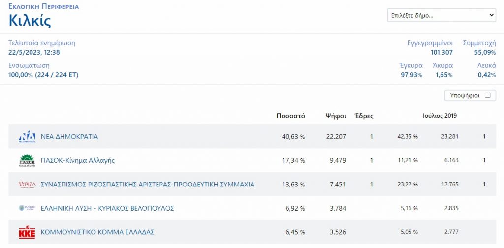 Στο Κιλκίς, η ΝΔ πήρε ποσοστό 40,63% και το ΠΑΣΟΚ- ΚΙΝΑΛ 17,34%. Ο ΣΥΡΙΖΑ ήρθε τρίτος με 13,63%