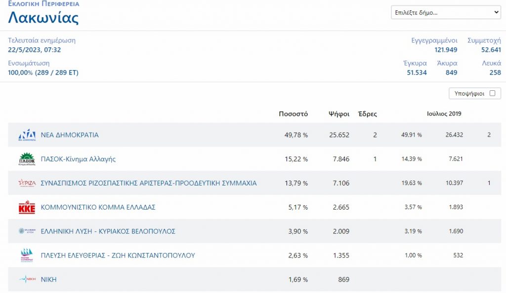 Στη Λακωνία, η ΝΔ έλαβε 49,78% και το ΠΑΣΟΚ-ΚΙΝΑΛ 15,22%. Ο ΣΥΡΙΖΑ 13,79%