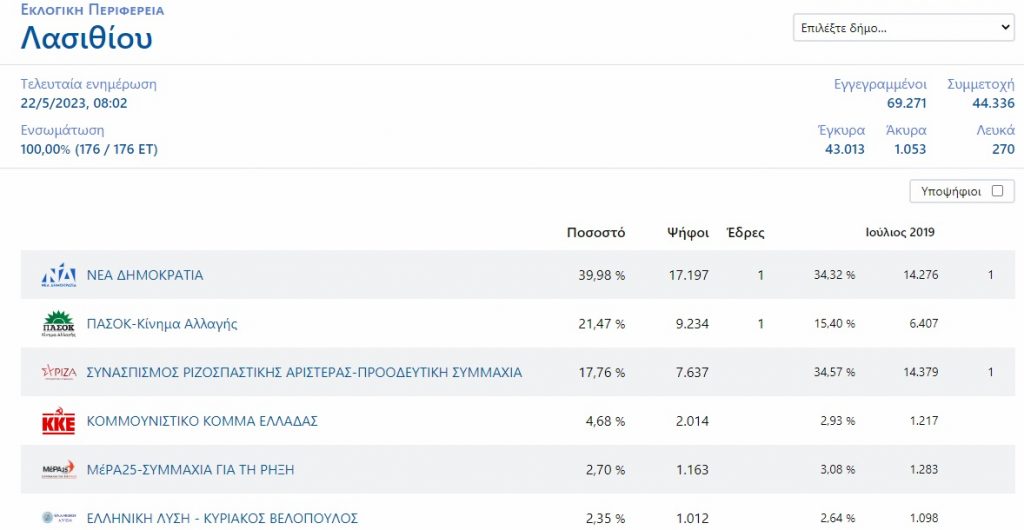 Στο Λασίθι, η ΝΔ ήρθε πρώτη με ποσοστό 39,98%, το ΠΑΣΟΚ-ΚΙΝΑΛ δεύτερο με 21,47% και ο ΣΥΡΙΖΑ τρίτος με ποσοστό 17,76%