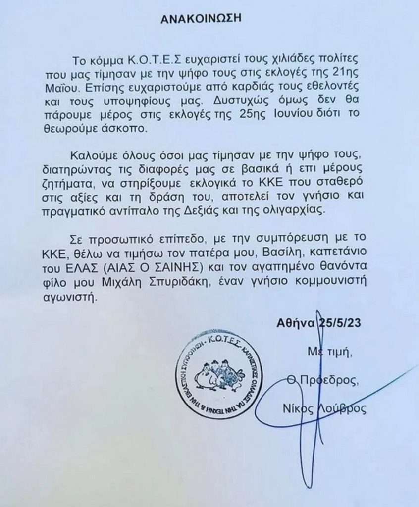 «Το κόμμα Κ.Ο.Τ.Ε.Σ ευχαριστεί τους χιλιάδες πολίτες που μας τίμησαν με την ψήφο τους στις εκλογές της 21ης Μαΐου. Επίσης ευχαριστούμε από καρδιάς τους εθελοντές και τους υποψηφίους μας. Δυστυχώς όμως δεν θα πάρουμε μέρος στις εκλογές της 25ης Ιουνίου διότι το θεωρούμε άσκοπο.