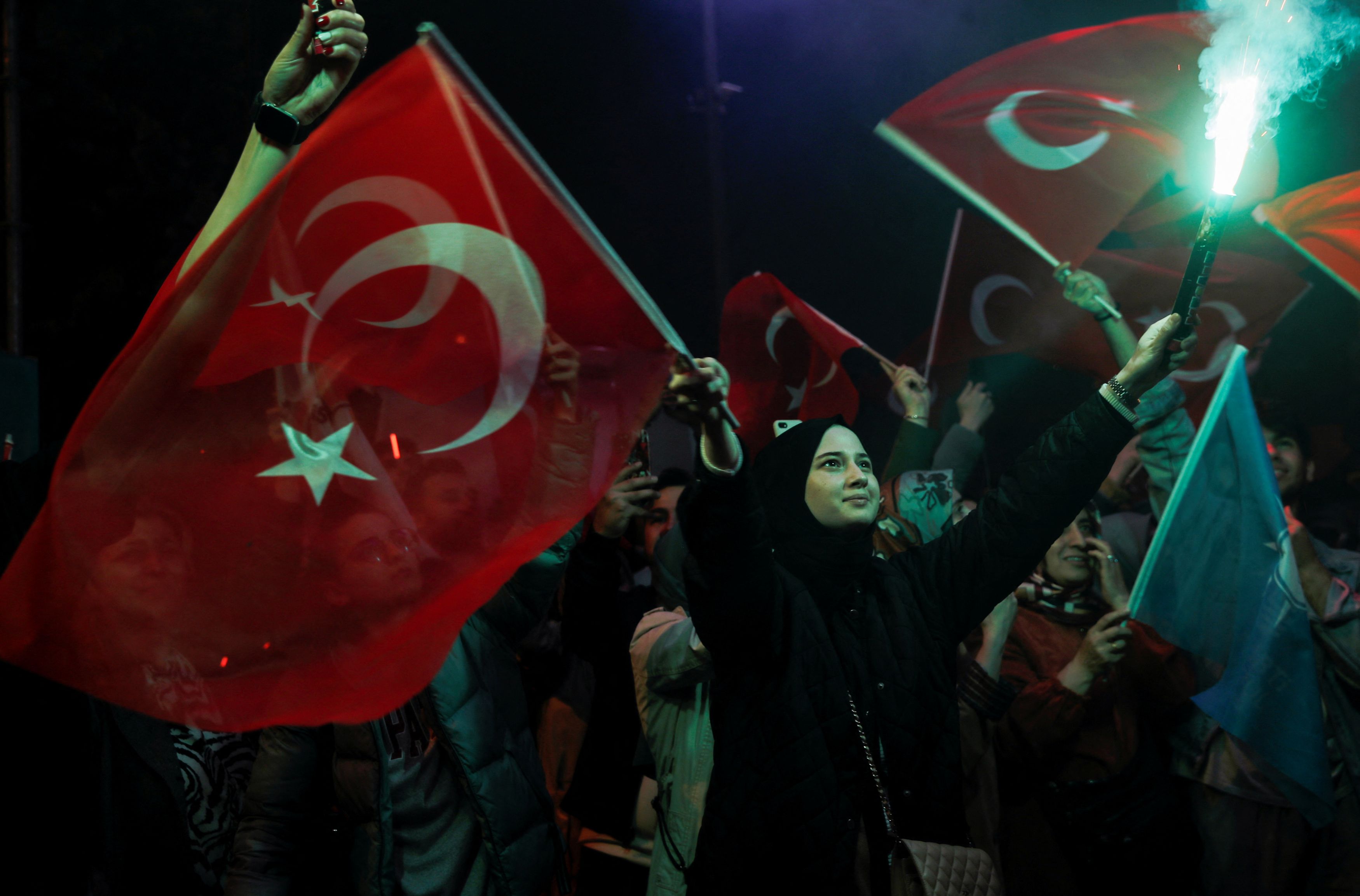 Ήδη από τις 5.30 αυτοκίνητα «φασκιωμένα», με μορφή του Τούρκου προέδρου και το τραγούδι του στη διαπασών, είχαν «στρατοπεδεύσει», κορνάροντας ρυθμικά, στην κεντρική αρτηρία, μπροστά από το Προεδρικό Μέγαρο, όπου αναμενόταν αυτή τη φορά ο νικητής να καταλήξει, ερχόμενος από την Κωνσταντινούπολη. Η λεωφόρος, στις 8 το βράδυ, είχε στην κυριολεξία φρακάρει από οχήματα που πανηγύριζαν, ρίχνοντας βεγγαλικά και φωτοβολίδες, ενώ τα αφηνιασμένα από τον ενθουσιασμό της νίκης στίφη τα χαιρετούσαν και τα βιντεοσκοπούσαν. Λίγα χιλιόμετρα μακρύτερα, λεωφορεία του κυβερνώντος κόμματος, με την γιγαντιαία φωτογραφία του Ερντογάν και το τραγούδι του, κάνανε κύκλους ξανά και ξανά, στοχευμένα, γύρω από το στρατηγείο των ηττημένων, όπου το κλίμα ήταν βαρύ.