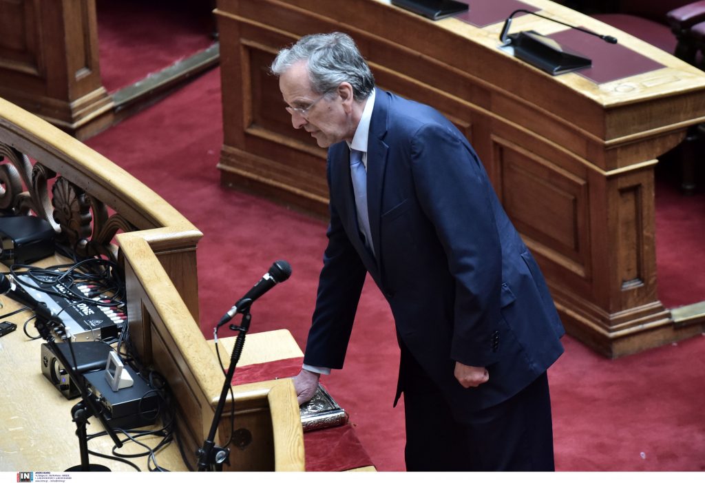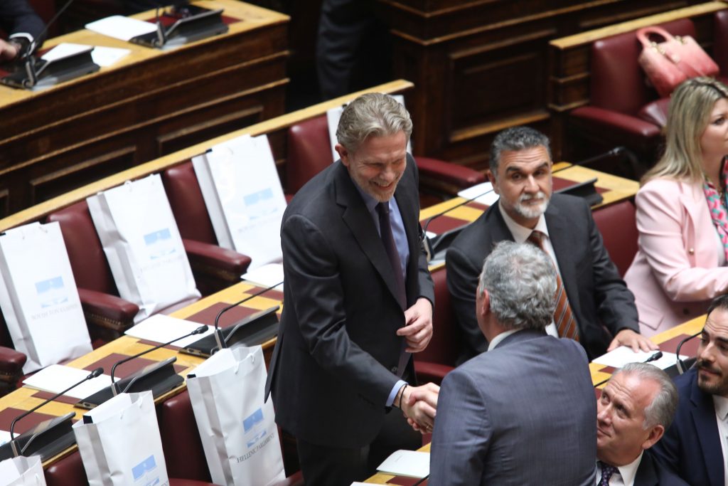 Έτσι προσήλθε χθες κατευθείαν από το αεροδρόμιο για να δώσει τον νενομισμένο θρησκευτικό όρκο. Δεν ήταν όμως μόνος στην αίθουσα, καθώς στα έδρανα των κρατικών αξιωματούχων βρέθηκε ο πρέσβης των ΗΠΑ στην Ελλάδα Γιώργος Τσούνης, ο οποίος τον συνεχάρη και ακολούθως πήγαν στο γραφείο του στο ισόγειο της Βουλής.