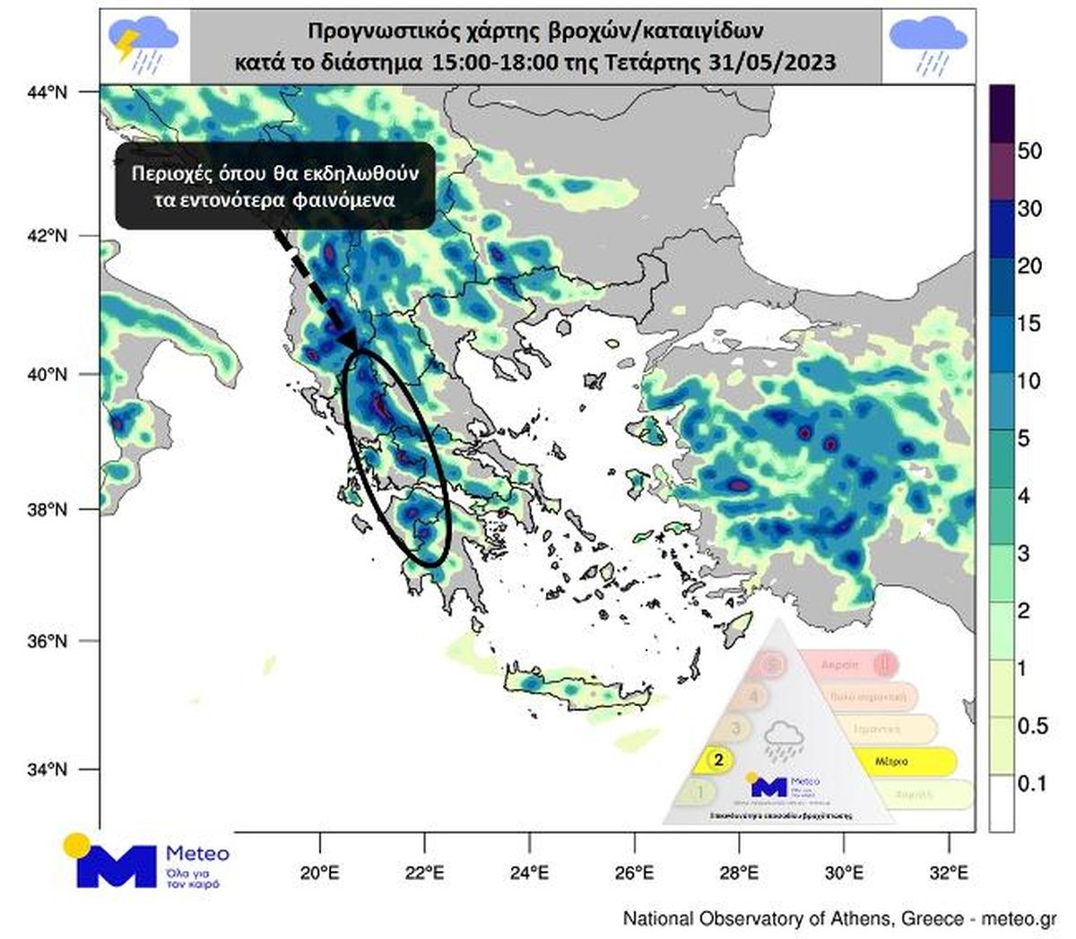 Βροχές και καταιγίδες θα εκδηλωθούν στο νομό και την πόλη τη Θεσσαλονίκης, ενώ στο νομό Αττικής θα επηρεαστούν κυρίως τα βόρεια και δυτικά τμήματα. Στον προγνωστικό χάρτη αποτυπώνεται η γεωγραφική κατανομή των φαινομένων το τρίωρο 15:00 – 18:00 (ώρα Ελλάδας) της Τετάρτης 31/05, διάστημα κατά το οποίο αναμένεται να κορυφωθεί η αστάθεια.