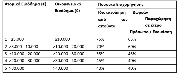Το ποσοστό της επιδότησης είναι κλιμακωτό, ανάλογα με την εισοδηματική κατηγορία στην οποία θα ενταχθεί ο αιτών και ορίζεται ως εξής: