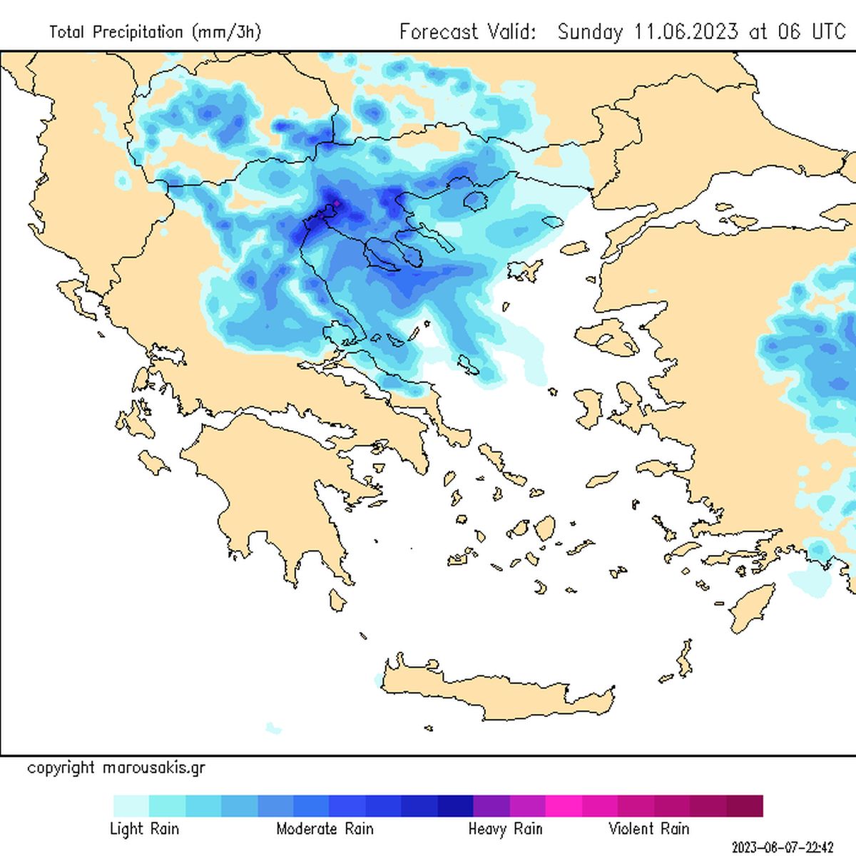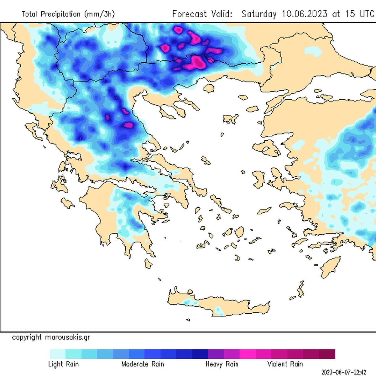 Ακολουθούν ενδεικτικοί χάρτες βροχόπτωσης, που σημαίνει ότι μπορεί να υπάρξουν αποκλίσεις. Από τις καταιγίδες πολύ πιθανόν να επηρεαστούν τόσο η Αττική όσο και η Θεσσαλονίκη.