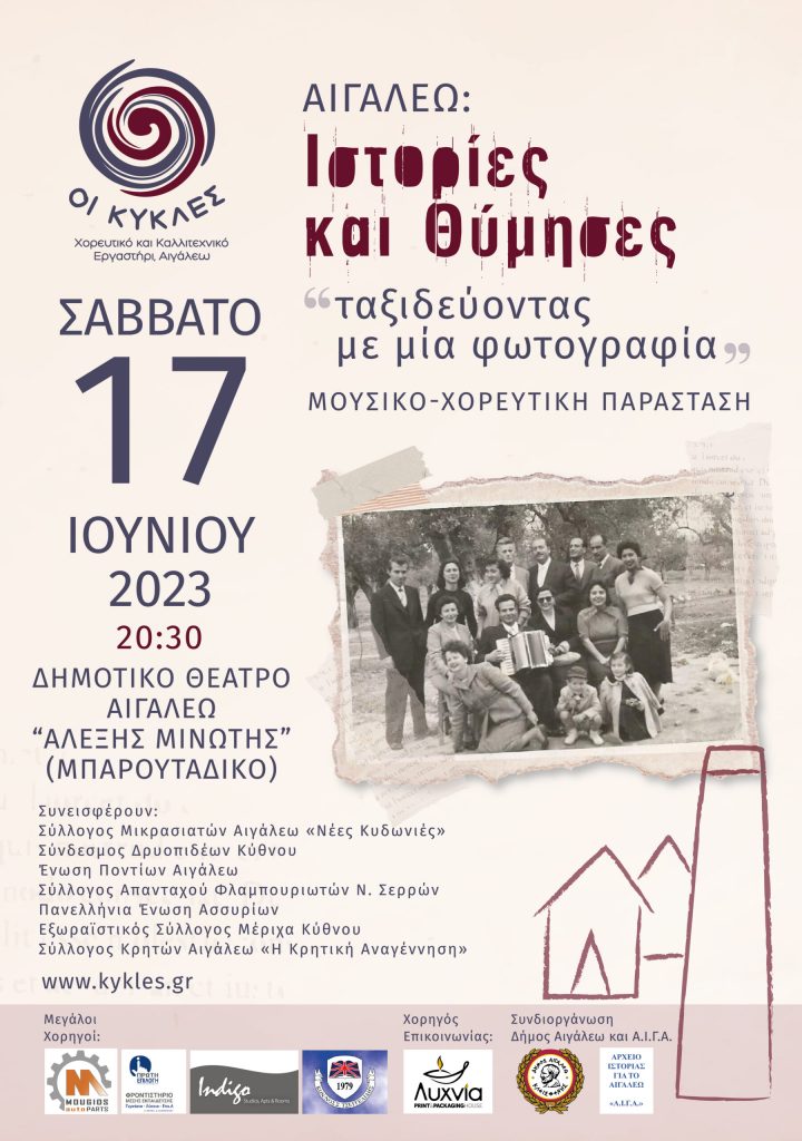 Σε ένα ταξίδι μέσα από τον χρόνο και την παράδοση, η μουσικο-χορευτική παράσταση «Ιστορίες και Θύμησες: Ταξιδεύοντας με μία φωτογραφία» φέρνει στο προσκήνιο το πολιτισμικό ψηφιδωτό του Αιγάλεω. Το Σάββατο 17 Ιουνίου 2023, στις 20.30, οι θεατές που θα επισκεφτούν το Δημοτικό Θέατρο Αιγάλεω «Αλέξης Μινωτής» θα ζήσουν ένα ταξίδι από το παρελθόν στο σήμερα την ιστορία της περιοχής μέσα από τις εθνοτοπικές ταυτότητες που συνθέτουν το μωσαϊκό της.