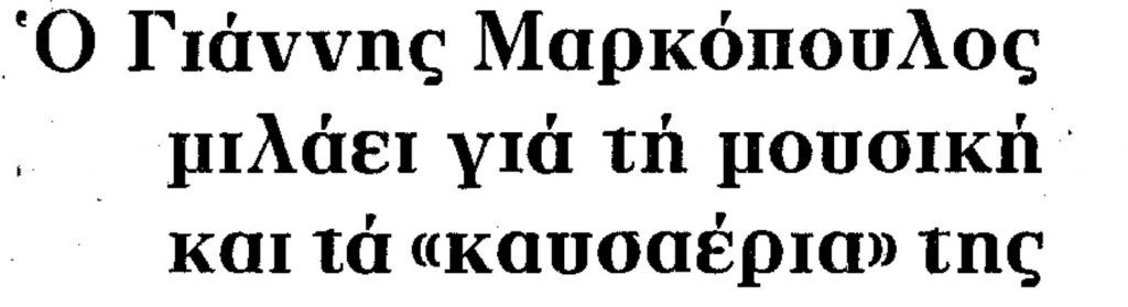 Στη συνέντευξή του στο “ΒΗΜΑ” και στον Γιώργο Κοντογιάννη στις 28 Οκτωβρίου 1972, ο Γιάννης Μαρκόπουλος μιλάει για την ελληνική μουσική και τον τρόπο που ο ίδιος τη “διάβασε” και επέλεξε να την προσεγγίσει.