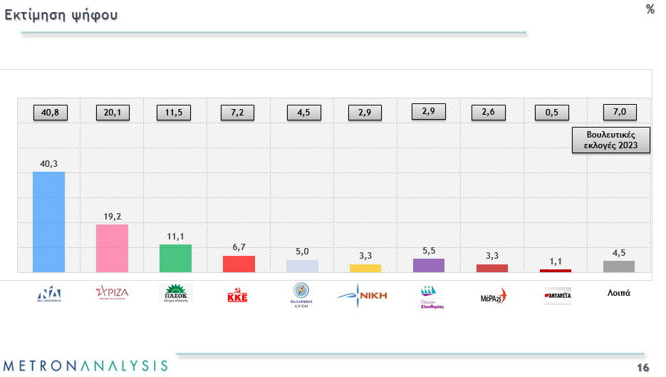 Αναλυτικότερα, στην εκτίμηση ψήφου η Νέα Δημοκρατία βρίσκεται στο 40,3%, την ίδια ώρα που ο ΣΥΡΙΖΑ βρίσκεται στο 19,2%. Ακολουθεί το ΠαΣοΚ με 11,1%, στο 6,7% βρίσκεται το ΚΚΕ, στο 5,5% η Πλεύση Ελευθερίας στο 5% η Ελληνική Λύση, στο 3,3% η Νίκη αλλά και το ΜέΡΑ 25.