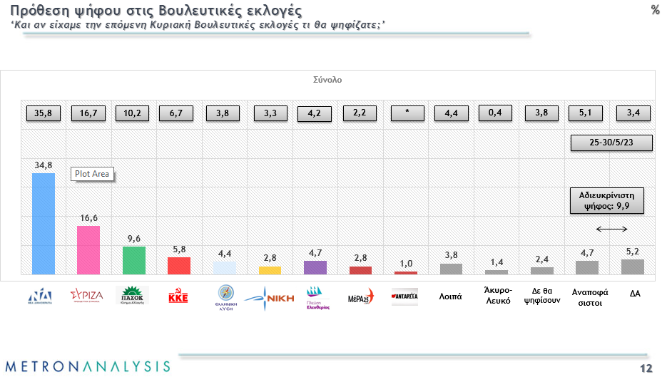 Όσον αφορά την πρόθεση ψήφου, το προβάδισμα της Νέας Δημοκρατίας έναντι του ΣΥΡΙΖΑ διαμορφώνεται στις 18 μονάδες. Πιο συγκεκριμένα, η Νέα Δημοκρατία βρίσκεται στο 34,8%, ενώ ο ΣΥΡΙΖΑ ακολουθεί με 16,6%.