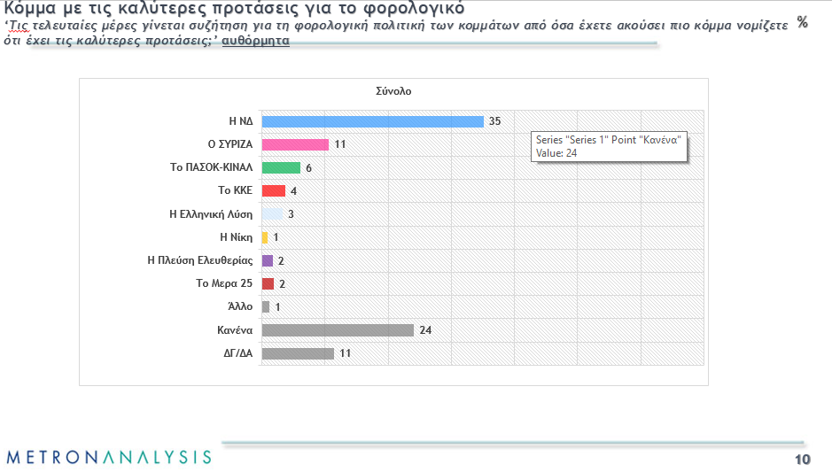 Τέλος, όσον αφορά τα φορολογικά ζητήματα, τα οποία βρίσκονται στο επίκεντρο του προεκλογικού διαλόγου το τελευταίο διάστημα, η Νέα Δημοκρατία προηγείται στην ερώτηση «Ποιο κόμμα έχει τις καλύτερες προτάσεις για το φορολογικό;» με 35%. Ο ΣΥΡΙΖΑ συγκεντρώνει 11%, ενώ το ΠαΣοΚ 6%.