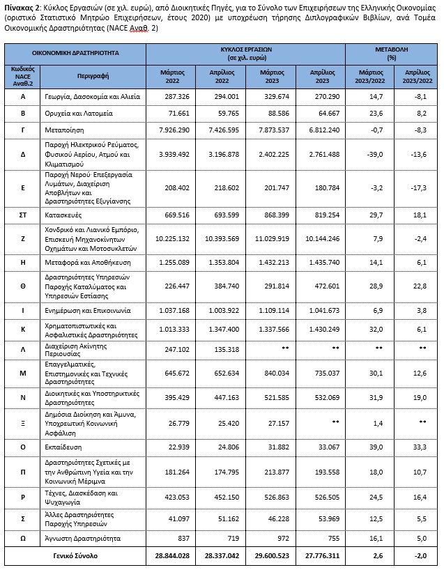 Τη μεγαλύτερη μείωση στον κύκλο εργασιών τον Απρίλιο 2023 σε σύγκριση με τον Απρίλιο 2022 παρουσίασαν οι επιχειρήσεις του τομέα Παροχή Νερού. Επεξεργασία Λυμάτων, Διαχείριση Αποβλήτων και Δραστηριότητες Εξυγίανσης, κατά 17,3%. Τη μικρότερη μείωση παρουσίασαν οι επιχειρήσεις του τομέα Χονδρικό και Λιανικό Εμπόριο, Επισκευή Μηχανοκίνητων Οχημάτων και Μοτοσυκλετών, κατά 2,4%, ενώ τη μεγαλύτερη αύξηση παρουσίασαν οι επιχειρήσεις του τομέα Εκπαίδευση, κατά 33,3%.