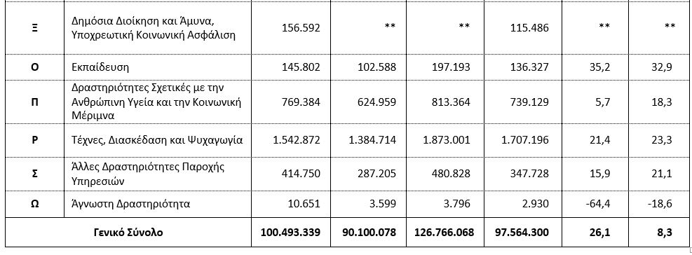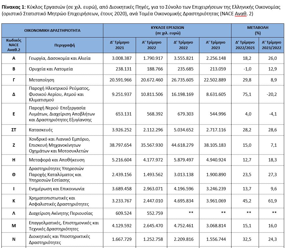Για το σύνολο των επιχειρήσεων και των δραστηριοτήτων της οικονομίας, ο κύκλος εργασιών το πρώτο τρίμηνο 2023 ανήλθε σε 97.564.300 χιλ. ευρώ, σημειώνοντας αύξηση 8,3% σε σχέση με το πρώτο τρίμηνο 2022, που είχε ανέλθει σε 90.100.078 χιλ. ευρώ. Τη μεγαλύτερη αύξηση στον κύκλο εργασιών το πρώτο τρίμηνο 2023 σε σύγκριση με το πρώτο τρίμηνο 2022 παρουσίασαν οι επιχειρήσεις του τομέα Χρηματοπιστωτικές και Ασφαλιστικές Δραστηριότητες, κατά 61,9%. Τη μικρότερη αύξηση παρουσίασαν οι επιχειρήσεις του τομέα Χονδρικό και Λιανικό Εμπόριο, Επισκευή Μηχανοκίνητων Οχημάτων και Μοτοσυκλετών, κατά 7,1%, ενώ τη μεγαλύτερη μείωση παρουσίασαν οι επιχειρήσεις του τομέα Παροχή Ηλεκτρικού Ρεύματος, Φυσικού Αερίου, Ατμού και Κλιματισμού, κατά 20,2% .