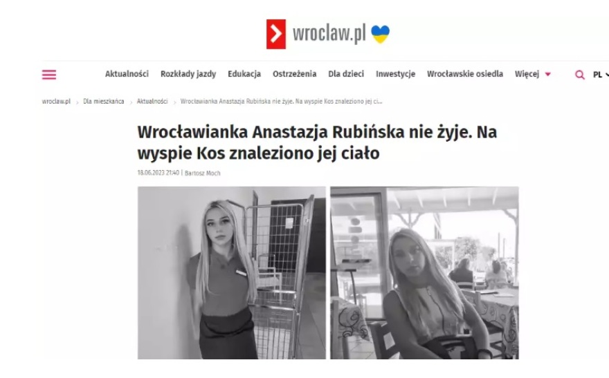 «Η Αναστάζια Ρουμπίνσκα από το Βρότσλαβ είναι νεκρή. Η σορός της βρέθηκε στο νησί της Κω» αναφέρει η ιστοσελίδα wroclaw.pl για την 27χρονη που βρισκόταν στην Κω για λόγους εργασίας.