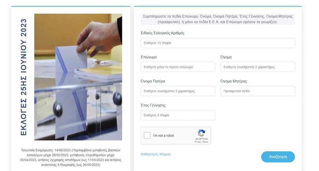 Στην σελίδα του υπουργείου εσωτερικών mpp.ypes.gov.gr, είναι αναρτημένοι αναλυτικά οι εκλογικοί κατάλογοι, ενώ αυτό που καλείστε εσείς να συμπληρώσετε είναι τα πεδία: