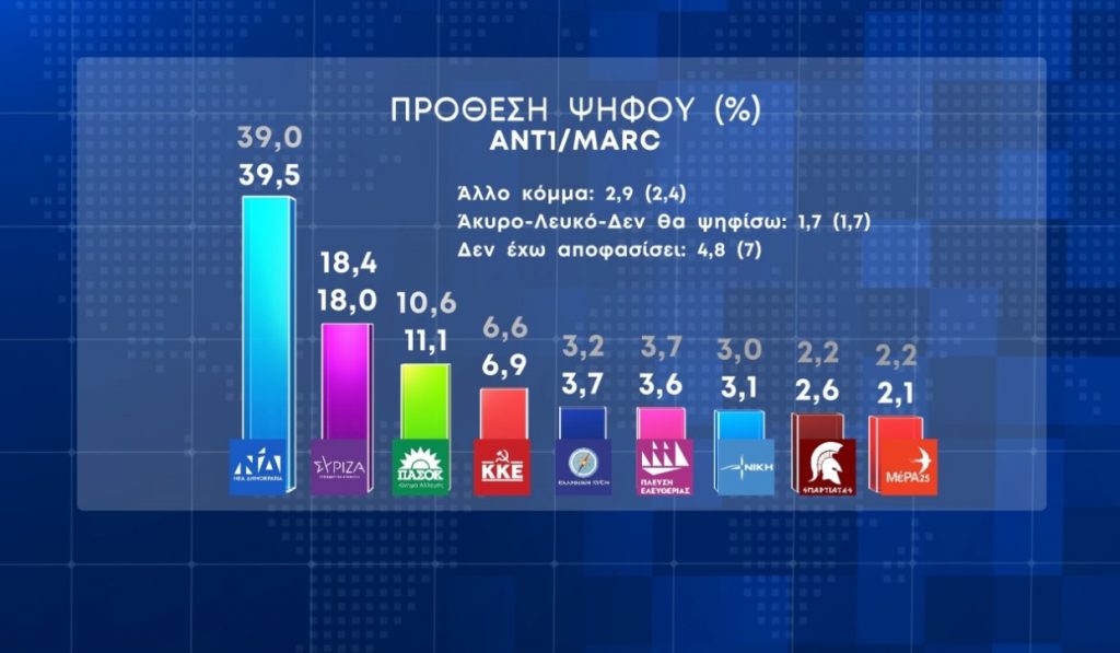 Ειδικότερα, στην πρόθεση ψήφου η ΝΔ συγκεντρώνει ποσοστό 39.5% έναντι 18% του ΣΥΡΙΖΑ. Ακολουθούν το ΠΑΣΟΚ-ΚΙΝΑΛ με 11,1%, το ΚΚΕ με 6,9%, η Ελληνική Λύση με 3,7%, η Πλεύση Ελευθερίας λαμβάνει ποσοστό 3,6% και η Νίκη 3,1%.