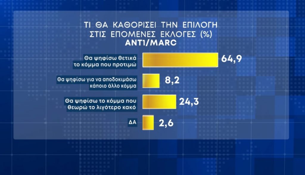 Ενδιαφέρον επίσης παρουσιάζει η ερώτηση αναφορικά με το τι θα καθορίσει την επιλογή κόμματος, με το 64,9% των ερωτηθέντων να απαντά πως θα ψηφίσει θετικά το κόμμα που προτιμά.