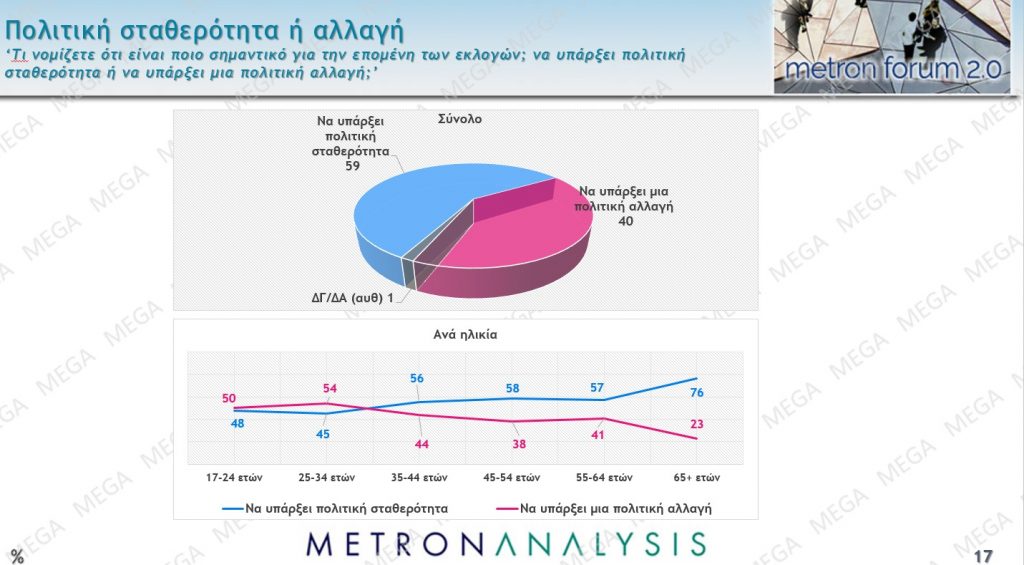 Ενδιαφέρον παρουσιάζει το εύρημα της εν λόγω δημοσκόπησης αναφορικά με το αν οι πολίτες θεωρούν πιο σημαντική την πολιτική αλλαγή ή την σταθερότητα, με το 59% να απαντάει την σταθερότητα.