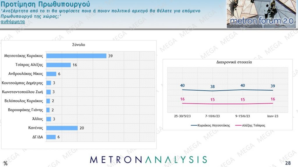 Ο Κυριάκος Μητσοτάκης με 39% θεωρείται καταλληλότερος πρωθυπουργός ανεξάρτητα από το τι θα ψηφίσει κάποιος. Ακολουθεί ο Αλέξης Τσίπρας με 16%, ο Νίκος Ανδρουλάκης με 6% και ο Δ. Κουτσούμπας με τη Ζ. Κωνσταντοπούλου με 3%.