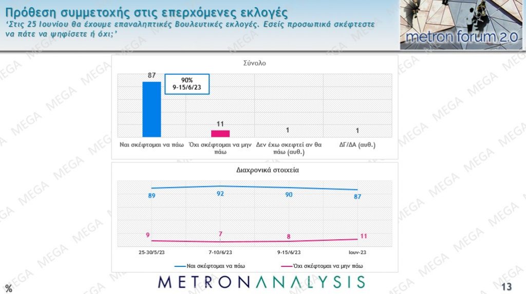 Αυτοδύναμη κυβέρνηση της Νέας Δημοκρατία αλλά και επτακομματική βουλή δείχνει η τελευταία δημοσκόπηση της Metron Analysis για το MEGA, πριν τις εθνικές εκλογές της 25ης Ιουνίου.