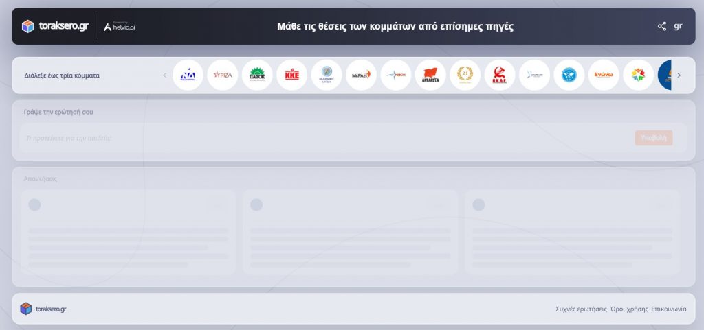Με το τελικό αποτέλεσμα του λογισμικού μέσα στο toraksero.gr, ο πολίτης μπορεί να βλέπει τι προτείνουν τα κόμματα για θέματα όπως παιδεία, φορολογία, κ.ο.κ. εύκολα και γρήγορα χωρίς να κάνει ο ίδιος την αναζήτηση.