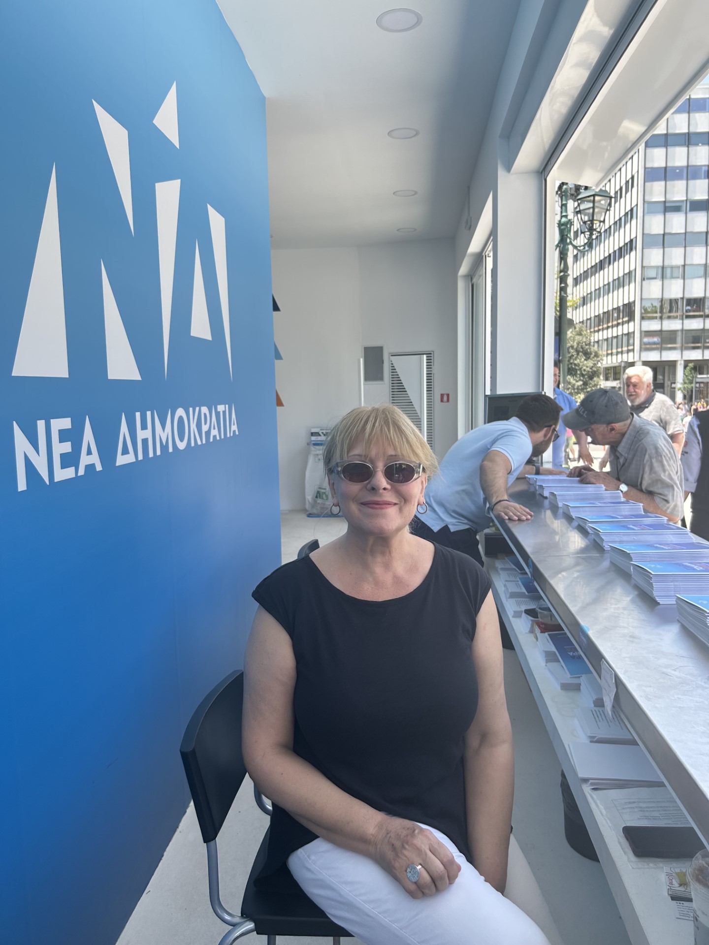 Δεν είναι «προάγγελος» της βραδινής ομιλίας του Κυριάκου Μητσοτάκη, ενημερώνει η κυρία Τζίνα Παναγιώτου, που μοιράζει φυλλάδια, καθισμένη πίσω από τον πάγκο του περιπτέρου της ΝΔ και απολαμβάνει τη μουσική και τους χορούς.
