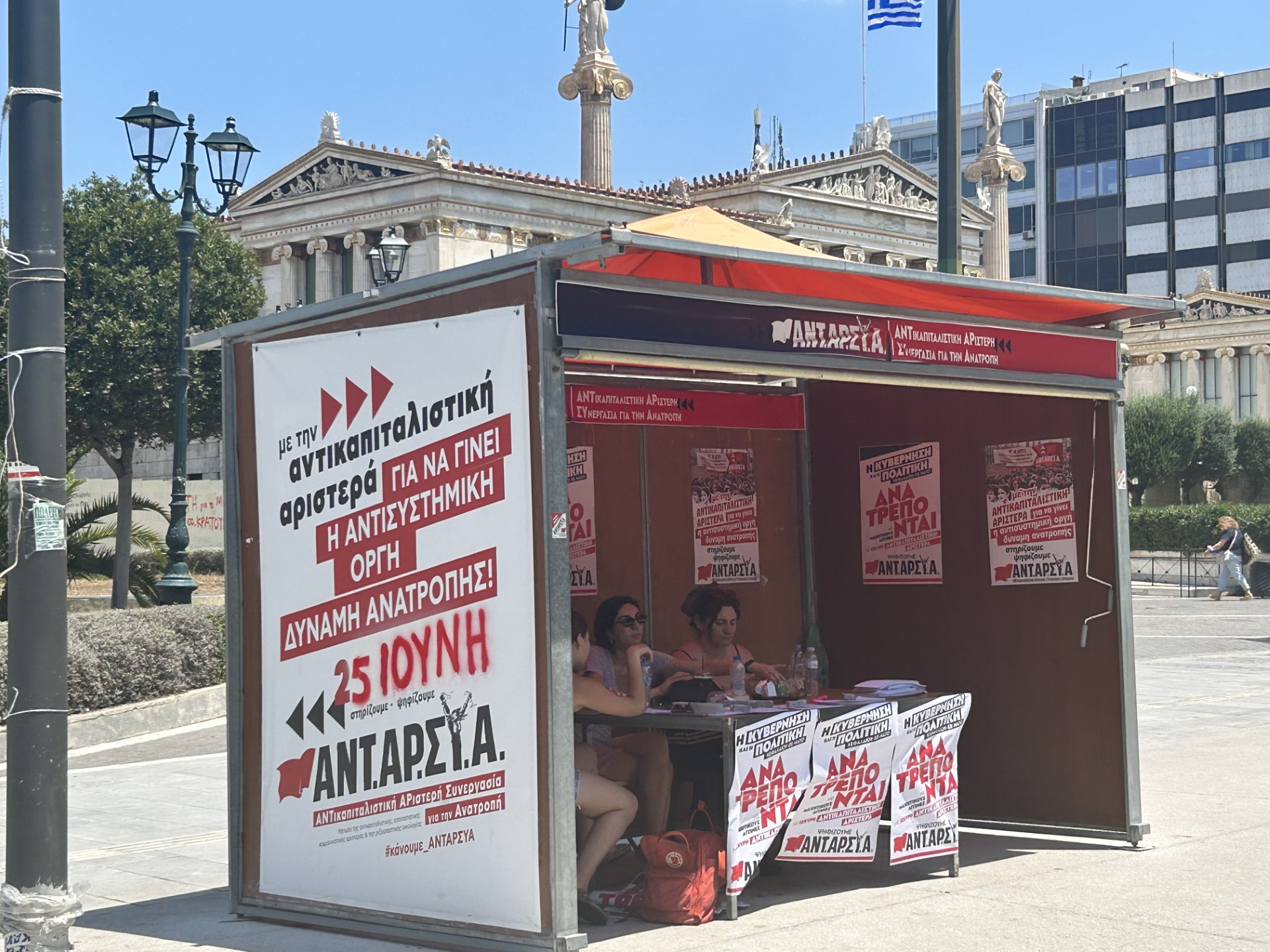 Στα Προπύλαια, τρία νεαρά κορίτσια τρώνε μπισκότα βρώμης και συζητούν για τα εκλογικά προγνωστικά, παρότι το κιόσκι τους το χτυπάει ανηλεώς ο ήλιος και βράζει. «Ο κόσμος έχει εγκλωβιστεί με επιδόματα, που όμως δεν καλύπτουν το σούπερ μάρκετ», λέει η Θεοδώρα, που δεν θεωρεί ότι η ΑΝΤΑΡΣΥΑ θα πάρει μεγαλύτερο ποσοστό στον β΄γύρο, παρόλο που «αγωνίζεται σε όλα τα ανοικτά μέτωπα». «Εμείς θα συνεχίσουμε να αγωνιζόμαστε για να ενισχυθεί η αντικαπιταλιστική Αριστερά», τονίζει, ενώ εμφανίζεται στην παρέα ένας από τους νεαρούς που ήταν στο περίπτερο του ΚΚΕ, με το φραπέ του στο χέρι και μια κοπέλα, που χαζεύει τα ψηφοδέλτια της ΑΝΤΑΡΣΥΑ, αναπάντεχα τα μετατρέπει σε βεντάλια.