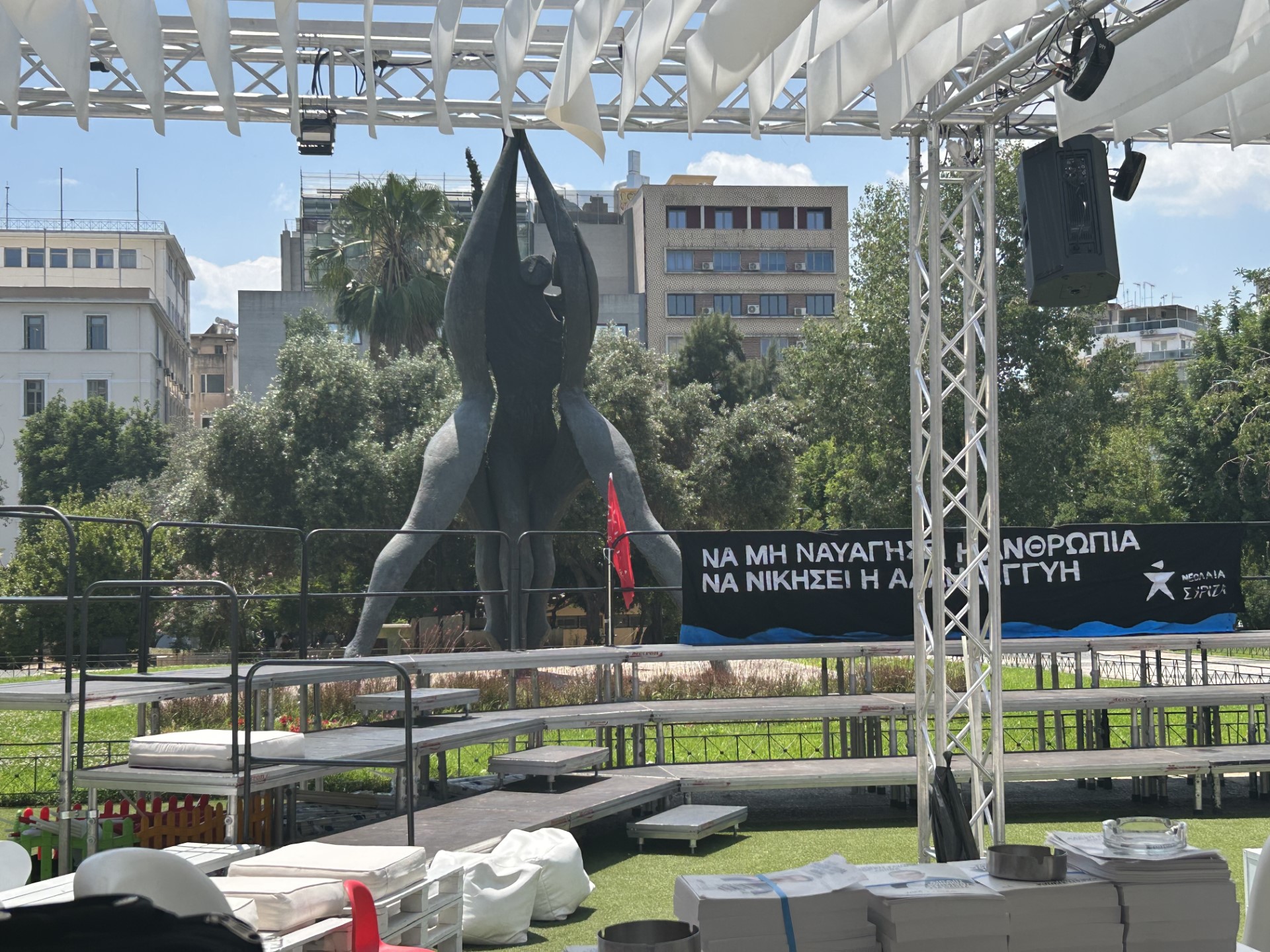 Απέναντι, στο μεγαθήριο-περίπτερο του ΣΥΡΙΖΑ, που ευθέως συναγωνίζεται αυτό της ΝΔ, με το πλεονέκτημα ενός μικρού αμφιθεάτρου στην πίσω πλευρά, μεσημέρι Παρασκευής, ακούγεται το «Πόσο ακόμα να κρατήσω» του Γιώργου Τζώρτζη. Το ρεπερτόριο της ημέρας συνεχίζεται με μερακλήδικα ρεμπέτικα. «Αυτή η μουσική θέλει ουζάκια», σχολιάζει μια γυναίκα στον κύριο που δουλεύει σε λαπ τοπ, συζητώντας για την ιστορία της πλατείας, τα ονόματά της, το άγαλμα της Εθνικής Συμφιλίωσης επί Έβερτ, που δέχτηκε κριτική. «Πάμε δίπλα να σε κεράσω το Βόσπορο»,προτείνει  στη συνομιλήτριά του. Δεν το εννοεί. Παραμένει σκυμμένος στο λαπ-τοπ του. «Εμείς απολαμβάνουμε καθημερινά τη μουσική και επιλέγουμε σήμερα έντεχνη», δηλώνει ,ενώ συνεχίζει να  εργάζεται. «Χτες είχαμε και αντάρτικα μετά την ομιλία του προέδρου στο Σύνταγμα. Άλλες ημέρες βάλαμε και κλασική μουσική. Φυσικά Θεοδωράκη, Μαρκόπουλο, συν αφιέρωμα στο Νότη Μαυρουδή».