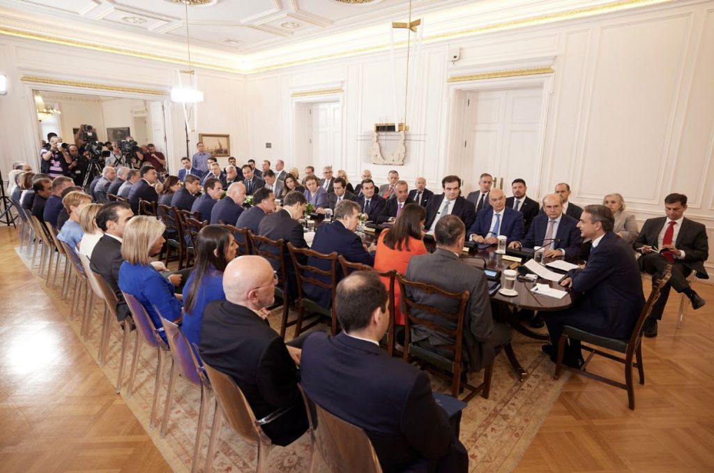 Η πρώτη μας συνεδρίαση πραγματοποιείται στο φως μιας μεγάλης εκλογικής νίκης, θα έλεγα μιας νίκης χωρίς προηγούμενο, γιατί πράγματι δεν υπάρχει άλλο παράδειγμα κυβέρνησης που να κατακτά μία δεύτερη συνεχή τετραετία με αυξημένα ποσοστά και με τεράστιες διαφορές από τους κύριους πολιτικούς της αντιπάλους. Είμαστε περήφανοι αλλά είμαστε και ευγνώμονες στον ελληνικό λαό για την επιλογή του.