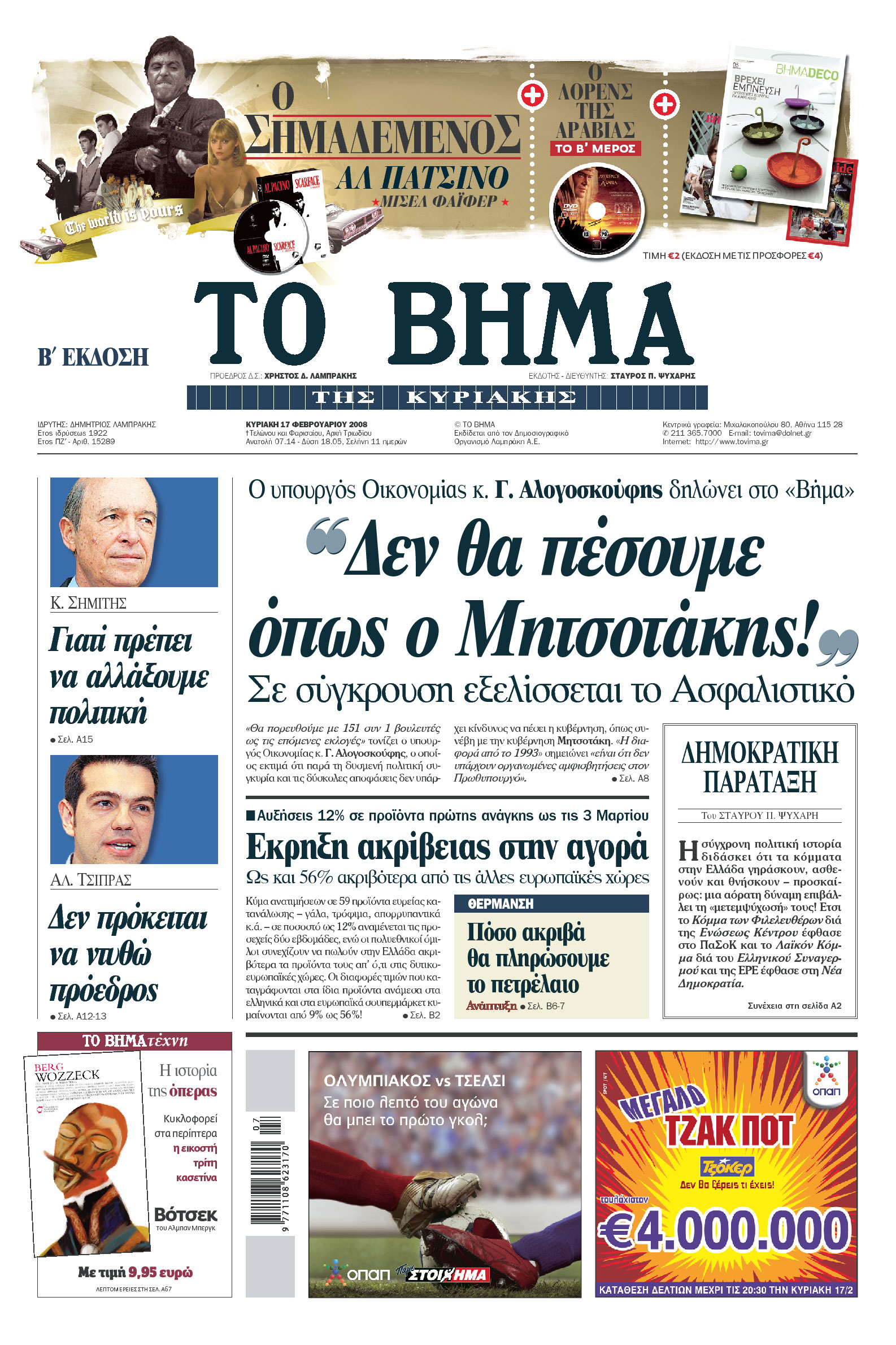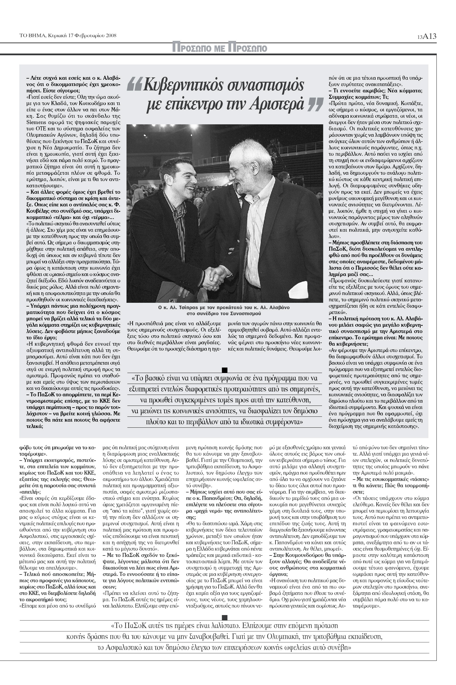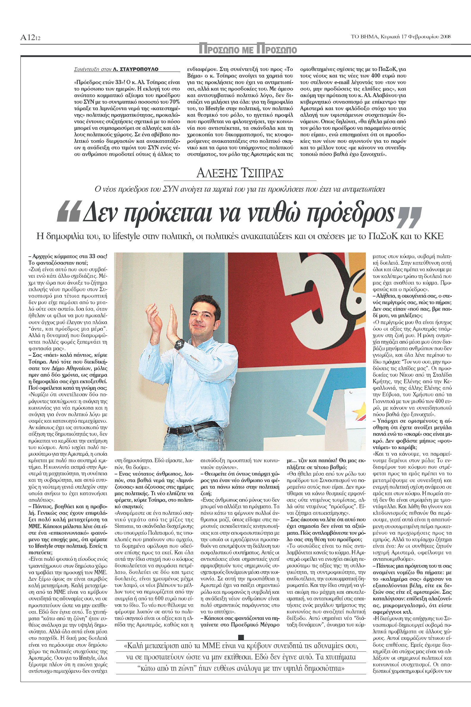 Στη συνέντευξή του προς «Το Βήμα» λίγες μέρες μετά την εκλογή του ως πρόεδρος του Συνασπισμού ο κ. Τσίπρας ανοίγει τα χαρτιά του για τις προκλήσεις που έχει να αντιμετωπίσει, αλλά και τις προσδοκίες του. Με άμεσο και αντισυμβατικό πολιτικό λόγο, δεν διστάζει να μιλήσει για όλα: για τη δημοφιλία του, το lifestyle στην πολιτική, τον πολιτικό και θεσμικό του ρόλο, το ηγετικό προφίλ που προτίθεται να φιλοτεχνήσει, την κοινωνία που αντιστέκεται, τα σκάνδαλα και τη χρεοκοπία του δικομματισμού, τις κυοφορούμενες ανακατατάξεις στο πολιτικό σκηνικό και τα όρια του υπάρχοντος πολιτικού συστήματος, τον ρόλο της Αριστεράς και τις οριοθετημένες σχέσεις της με το ΠαΣοΚ, για τους νέους και τις νέες των 400 ευρώ που του στέλνουν e-mail λέγοντάς του «τον νου σου, μην προδώσεις τις ελπίδες μας», και ακόμη την πρόταση του κ. Αλ. Αλαβάνου για κυβερνητικό συνασπισμό με επίκεντρο την Αριστερά και τον φιλόδοξο στόχο του για αλλαγή των υφιστάμενων συσχετισμών δυνάμεων. Οπως δηλώνει, «θα ήθελα μέσα από τον ρόλο του προέδρου να παραμείνω αυτός που είμαι», ενώ επισημαίνει ότι οι προσδοκίες των νέων που αγωνιούν για το παρόν και το μέλλον τους «με κάνουν να συνειδητοποιώ πόσο βαθιά έχω ξανοιχτεί».