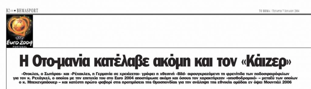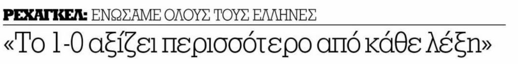 «”Ρέχακλες (σ.σ. προσωνύμιο που συνδύαζε το Ρεχάγκελ με το Hercules/ Ηρακλή) , η Γερμανία σε χρειάζεται!” ήταν χθες ο πρωτοσέλιδος τίτλος της Bild – Zeitung», σημείωνε «TO BHMA», «Όλοι ξέρουν ότι η χώρα μας τον χρειάζεται, ότι πρέπει να σώσει το ποδόσφαιρό μας. Όμως οι Έλληνες δεν τον αφήνουν να φύγει, δημιουργούν συνεχώς προβλήματα».