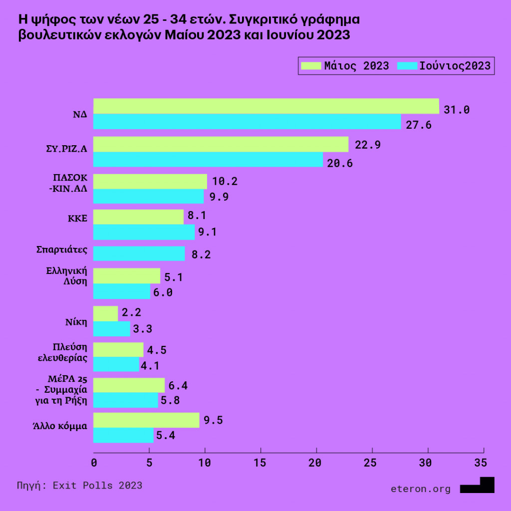 Το Eteron συνεχίζοντας τον διάλογο που έχει ανοίξει, στο πλαίσιο του project “Youth – Voice On”, για την ψήφο των νέων, παρουσιάζει σήμερα τα σχετικά συγκριτικά γραφήματα, όπως προκύπτουν από τα exit polls στις βουλευτικές εκλογές της 21ης Μαΐου και της 25ης Ιουνίου του 2023: α/ στην ηλικιακή ομάδα 17 – 24 ετών, β/ πιο ειδικά σε όσες και όσους είναι φοιτητές και φοιτήτριες και γ/ στην ηλικιακή ομάδα 25 – 34 ετών.