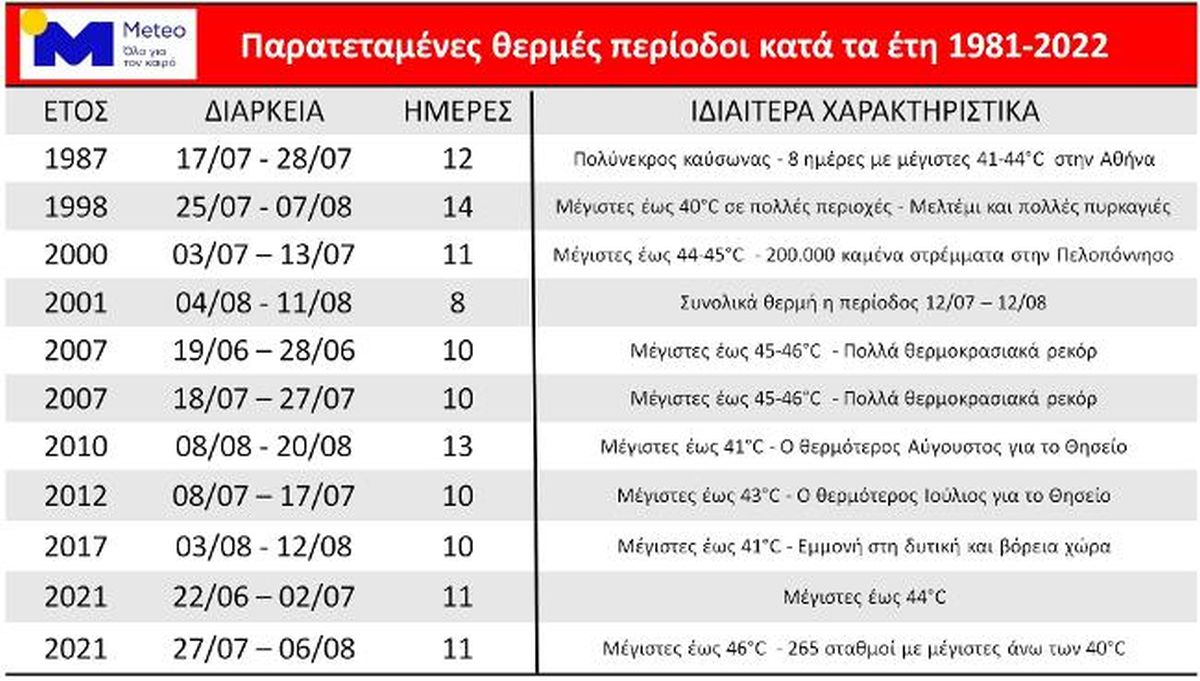 Με αφορμή το επερχόμενο παρατεταμένο θερμό κύμα, το Εθνικό Αστεροσκοπείο Αθηνών/meteo.gr παρουσιάζει καύσωνες με μεγάλη διάρκεια που εκδηλώθηκαν την περίοδο 1981-2022.
