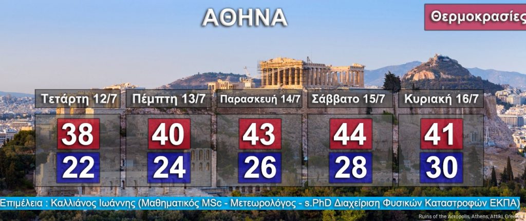Όπως αναφέρει σε ανάρτησή του ο γνωστός μετεωρολόγος Γιάννης Καλλιάνος, οι πιο αυξημένες θερμοκρασίες θα σημειωθούν από την Παρασκευή (14/07) έως την Κυριακή (16/07), ενώ σύμφωνα με νεότερα στοιχεία «μπορεί από τη Δευτέρα και έπειτα να υποχωρεί ελαφρώς ο υδράργυρος, όμως πιθανότατα και η επόμενη εβδομάδα θα είναι θερμή».