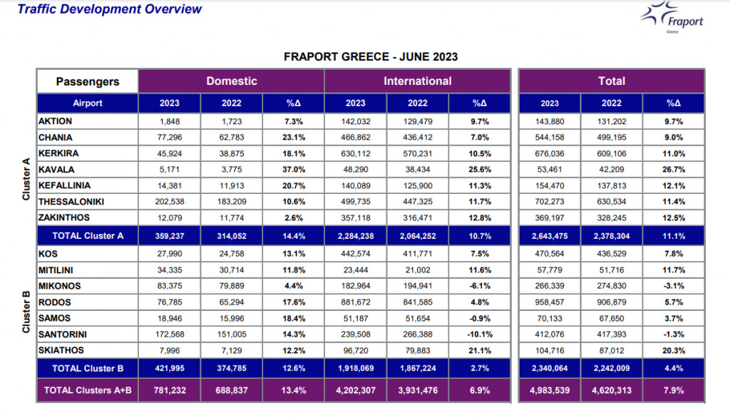 Η συνολική επιβατική κίνηση στο τέλος του πρώτου εξαμήνου εμφανίζεται αυξημένη κατά 14,3% έναντι του πρώτου εξαμήνου του 2022 και κατά 7,8% σε σύγκριση με τα 10,93 εκατ. επιβατών του 2019.