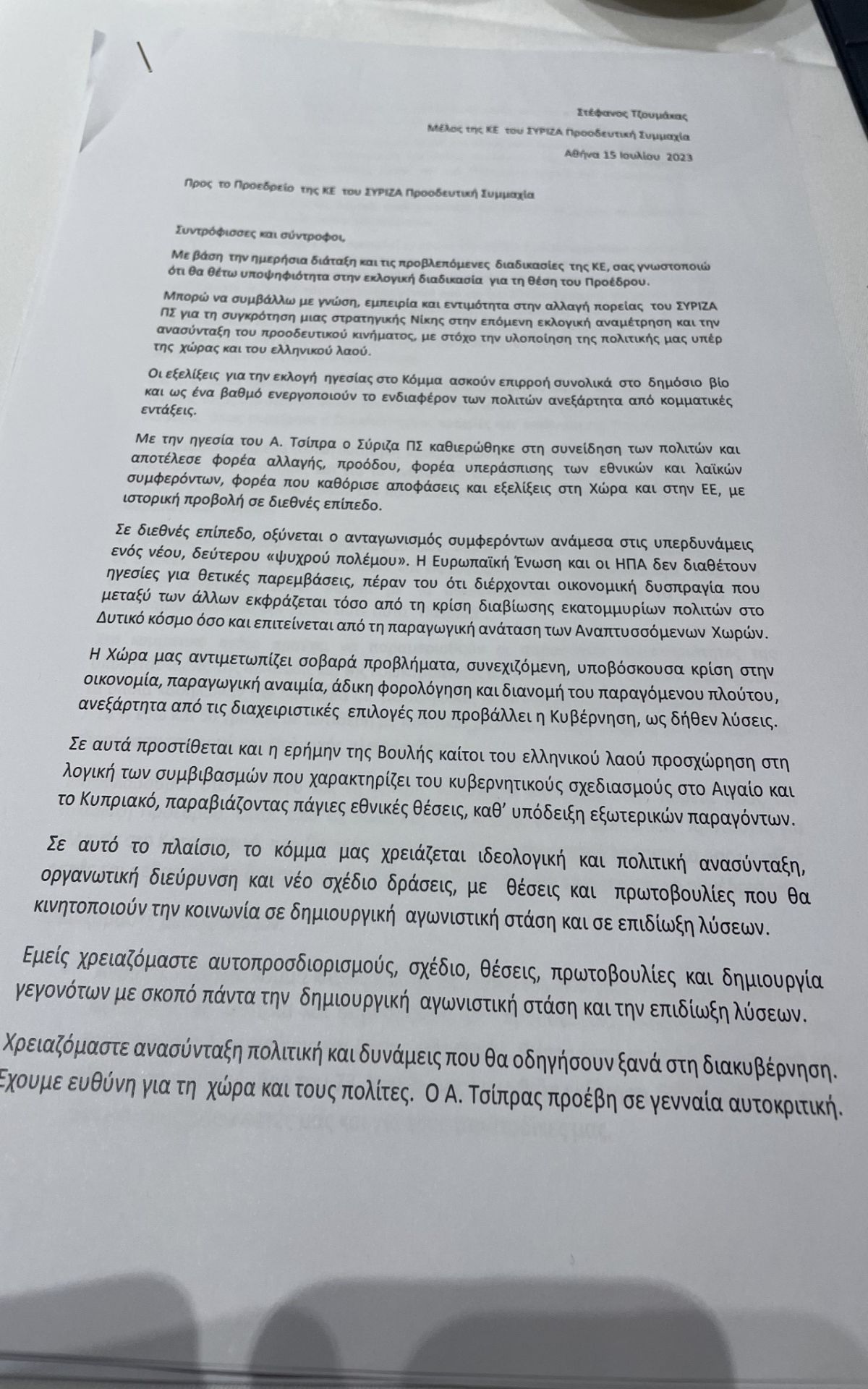 Την υποψηφιότητά του για την προεδρία του ΣΥΡΙΖΑ-ΠΣ κατέθεσε στην Κεντρική Επιτροπή ο Στέφανος Τζουμάκας.