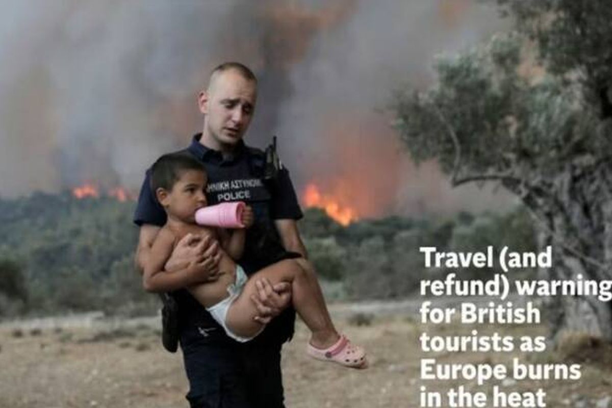 Στο πρωτοσέλιδο της Mirror ο πυροσβέστης που κρατά στην αγκαλιά του ένα παιδί, καθώς πίσω του οι πύρινες γλώσσες καταπίνουν τα πάντα. «Ένα παιδί μεταφέρεται από το φλεγόμενο σπίτι καθώς οι θερμοκρασίες – κόλαση σαρώνουν ολόκληρη την Ευρώπη. Αυτή είναι η τρομακτική αλήθεια της σημερινής κλιματικής κρίσης».