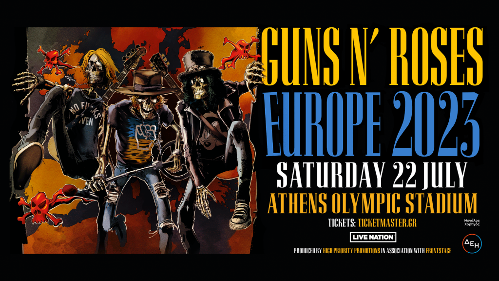 Η αντίστροφη μέτρηση για την συναυλία των θρύλων του hard rock, Guns N’ Roses το Σάββατο 22 Ιουλίου στο Ολυμπιακό Στάδιο έχει αρχίσει. Tο εμβληματικό συγκρότημα, που άλλαξε τον κόσμο της ροκ μουσικής, ολοκληρώνει την ευρωπαϊκή του περιοδεία με τελικό σταθμό την Αθήνα. Θα δούμε μαζί τους Axl, Slash, Duff 30 χρόνια μετά, από το 1993, ξανά στον ίδιο χώρο, για να θυμηθούμε και να τραγουδήσουμε μαζί τους, τα εμβληματικά τους τραγούδια.