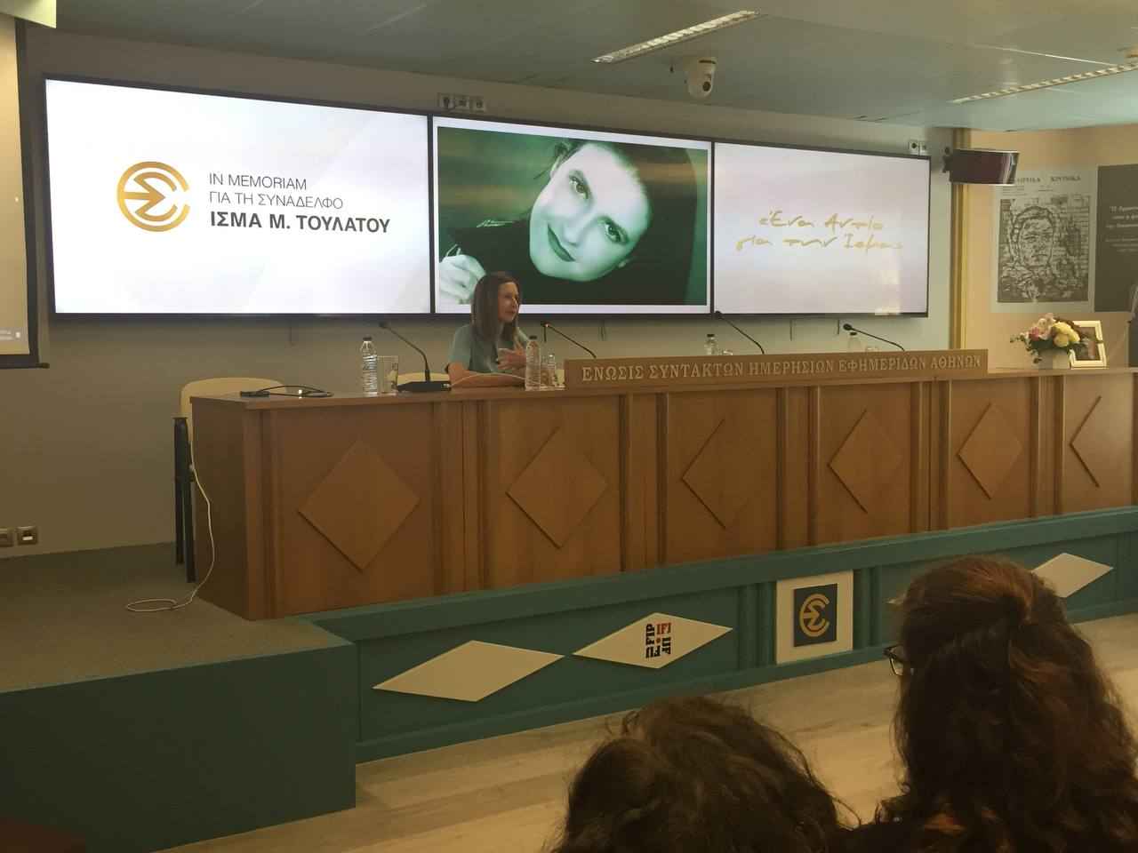 Κάποιοι χαίρονταν που και πάλι, μετά από καιρό, έβλεπαν ο ένας τον άλλο, όμως η ματιά τους δήλωνε απέραντη θλίψη, σαν να κοίταζαν όλοι, με απορία, το κενό. Θα μπορούσαν όμως τα πράγματα να είναι διαφορετικά; Η συγκέντρωση την περασμένη Τετάρτη το μεσημέρι στην αίθουσα εκδηλώσεων «Γεώργιος Καράντζας» στον πρώτο όροφο των γραφείων της Ένωσης Συντακτών Ημερησίων Εφημερίδων Αθηνών στην οδό Ακαδημίας, ήταν για ένα τελευταίο αποχαιρετισμό, κυρίως συναδέλφων, προς την δημοσιογράφο Ισμα Μ. Τουλάτου που εντελώς ξαφνικά, τόσο νέα, έφυγε πριν από λίγο καιρό από αυτόν τον κόσμο.